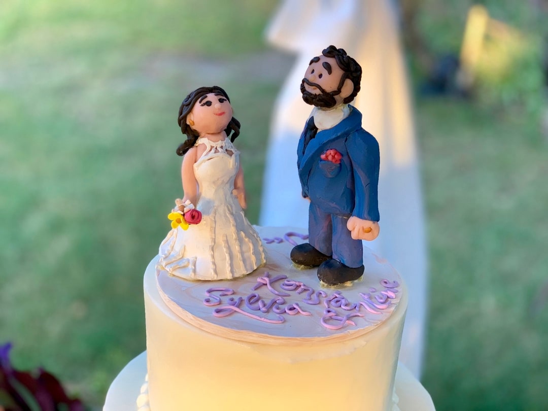 I love any excuse to play with Sculpey, and I preferred matching the cake-toppers I made for my sister’s wedding (currently on display in their living room) vs. matching the refinement I applied to every other design aspect of the wedding. I had fun making these. The only difficulty here was hiding the cake toppers from my fiancé so as to not reveal my dress. 🤷
